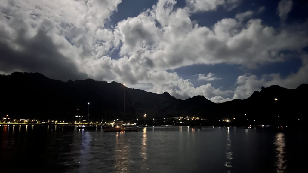 We’d been anchored a while, maybe too long. I knew this because I’d been finding more hair on board, feline and human. Usually I can get it to blow off the back of the boat easily but using the stern anchor keeps our side to the wind and bow into the swell it swirls around and stays longer than normal. I really should get out the wind scoop and see if that helps funnel more wind down below than our usually more effective hatches. Barnacles are growing all over the place underwater and our anchor chain looks like a wooly mammoth’s trunk. It’s growing season and while I’m itching to move, Taiohae is growing on me too. The ladies at the fruit stand at the dinghy dock smile and say kaoha, the grocery clerk practices her English with me, and I’ve made a few more connections on shore. Lots of little projects are getting done on the boat, laundry is mostly managed, and it’s nice to have a bit of routine with work, school, and play.