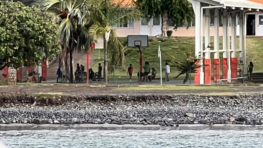 One morning I was sipping my morning coffee in the cockpit delaying the start of the day. We’re anchored near the shore in front of the high school and I was watching the kids walking around the schools grounds when what did my eyes see under the covered area they use as a gym? ERGS! What a nightmare wonderful thing! (Ergs, or ergometers, specifically made by Concept 2, are rowing training devices that rowers and others love to hate suffering through workouts on.) I paddled to the beach between us and the school and went to see if I could find out anything about what they’re doing with them. I explained to a woman who was going to her car outside the schools fence that I’d love to help out with the ergs if I could. Soon enough I met one of the gym teachers whose English was good and she let me come and help the kids do their 1k races! They had the ergs hooked up together so that the rowers could see their race on their monitors. I’m not sure many of them noticed what lane they were in and most went out hard and then barely were able to finish the 3.5-6 minutes it took to complete the thousand meters. They invited me back to help with other classes another day.